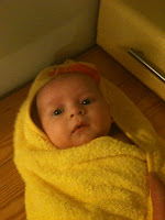 After his bath, the Tiny Tubster relaxes in his chicken towel. Cutest Baby Ever!